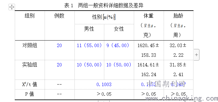 研究于2018年10月到2020年5月开展,共纳入40例观察对象,均为上述时间段在医院接受治疗的呼吸窘迫综合征早产儿,根据抽签结果将所有对象均分成实验组与对照组。表1提示两组一般资料详细数据,互相对比,结果均提示不存在很大差异(P﹥0.05)。