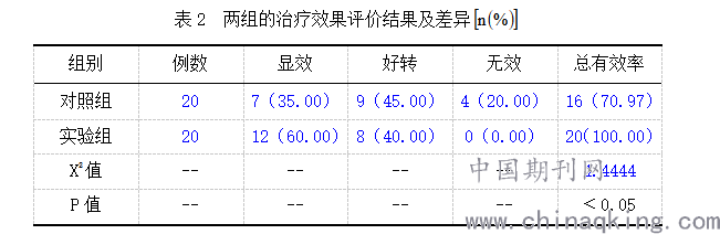 2.1表2内容提示两组的治疗效果评价结果,总有效率互相对比,提示实验组更高,存在很大差异(P﹤0.05)。