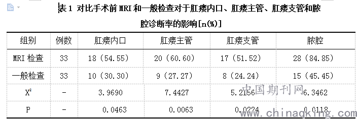 本次实验数据证实,手术前MRI检查肛瘘内口、肛瘘主管、肛瘘支管和脓腔诊断率高于一般检查,组间对比(P<0.05),其说明了在手术前开展核磁共振技术诊断,能够更好的了解病情程度,有利于手术的开展。