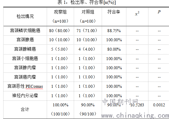 宫颈癌作为常见恶性肿瘤,疾病本身便属于应激源,加之病变组织会影响生殖器官完整性,影响患者身心健康及生活质量,为此临床需及早治疗,并采取有效治疗方案。宫颈组织活检是目前诊断宫颈癌常见方案,针对巴氏II级、鳞状上皮细胞异常LSIL者、阴道镜反复检查呈可疑阳性或阳性者,均可进一步进行宫颈组织活检。常规活检从患者身体病变部位取出小块组织,通过手术切除标本制成病理切片,而后对细胞及组织的形态进行观察,以明确其病变情况,为临床诊断提供参考,亦可协助医师评估其病变程度,进而了解疾病发展趋势,对其预后效果进行预测,且阴道镜下活检较常规活检准确率高,但其无法发现宫颈管内病变组织,因此在早期病变诊断中有一定局限性。结果显示:观察组检出率100.00%与高于对照组90.00%检出率,且两种方案符合率为90.00%,证实阴道镜活检漏诊率较高,在宫颈癌诊断中可行性不及术后石蜡病理检查。