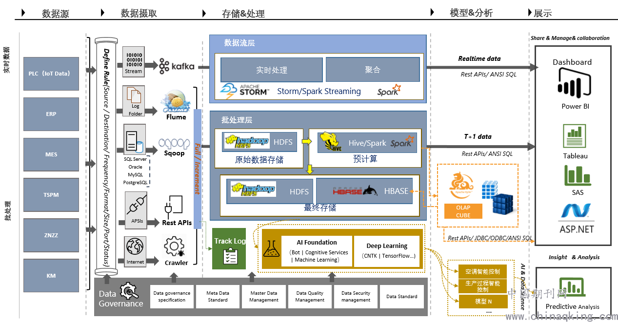 大数据平台将生产过程和数据整合起来,将实时数据和离线数据打通,使数据可以实现更大规模的关联计算,挖掘出数据更大的价值,从而实现数据驱动生产。大数据平台使得数据分析技术可以落地应用,实现自身价值。从数据源开始,质量分析平台可分为五个部分:数据采集、数据处理、数据存储、数据挖掘、以及数据质量管理。为了支撑数据可视化分析和设备智能控制的需求,初步确定制丝车间大数据平台详细架构设计如下图。