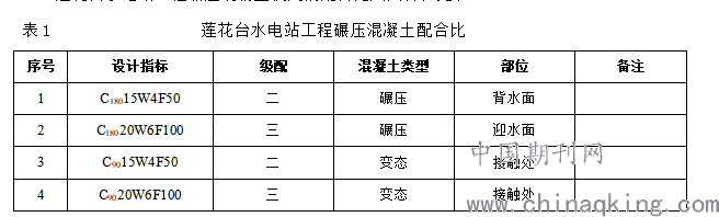 莲花台水电站工程碾压混凝土使用的配合比共四种,见表1