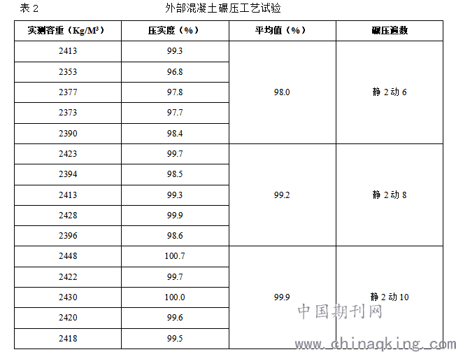 根据《水工碾压混凝土施工规范》DL/T 5112-2009要求,建筑物的外部(迎水面)混凝土相对密度不应小于98%,内部(背水面)混凝土相对密度不应小于97%。现场通过振碾6遍、8遍、10遍各测五个点平均,最终选择外部、内部混凝土最优遍数为8遍。碾压时,无论其有振碾压遍数是多少,有振碾前均无振碾压2遍,最后再静碾2遍收面。外部混凝土碾压工艺试验见表2,内部混凝土碾压工艺试验见表3。