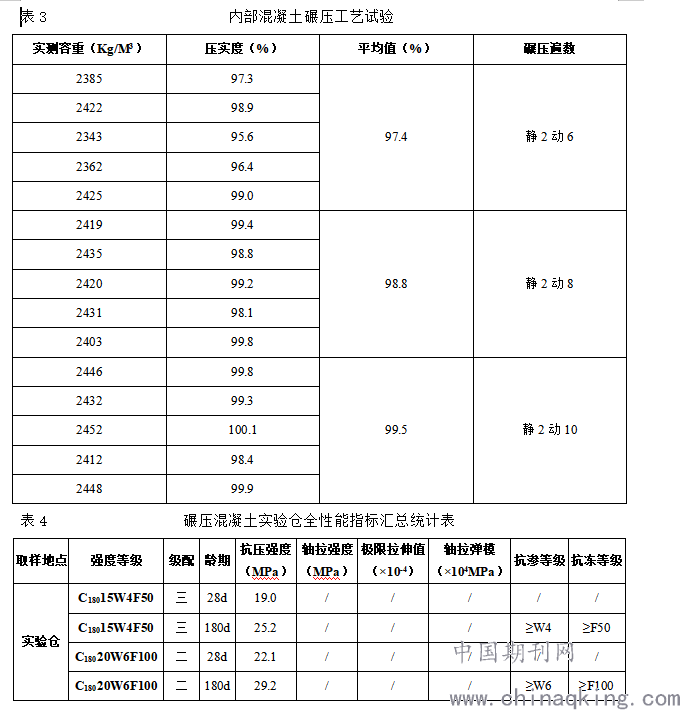 碾压遍数确认的工艺试验,及时进行碾压混凝土现场取样检测。确保试验检测数据的准确性和及时性,及时向项目部提供有关信息。碾压混凝土实验仓全性能指标汇总统计见表4。