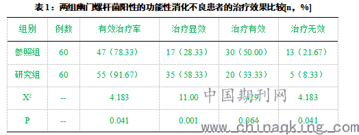 对比两组幽门螺杆菌阳性的功能性消化不良患者的治疗效果,组间差异具有统计学意义(P<0.05)。详见下表1: