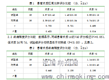 1.4 观察指标 (1)术后1d、3d和7d,定期观察肛周水肿程度,无水肿计0分,水肿面积<25%计2分,水肿面积在25%-50%之间计4分。采用VAS量表[3]定期评价疼痛程度,分值范围0-10分,疼痛越严重、得分就越高。(2)观察患者精细排便功能恢复情况[4],正常的标准是:大便、排气、肠液均正常;部分失禁的标准是:对肠气、稀便控制不佳,偶尔污染内裤;完全失禁的标准是:对成形大便不能控制。