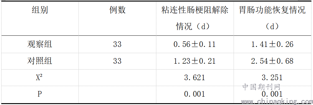 在本文中,针对粘连性肠梗阻解除情况,与对照组下班关闭观察组接触时间更短,P<0.05。针对胃肠功能恢复情况,对比对照组,观察组恢复时间更短,P<0.05。对比两组炎性因子情况,观察组低于对照组,P<0.05。对比两组生活质量,观察组抑郁SDS评分更低,生活质量相对较为良好,P<0.05。
