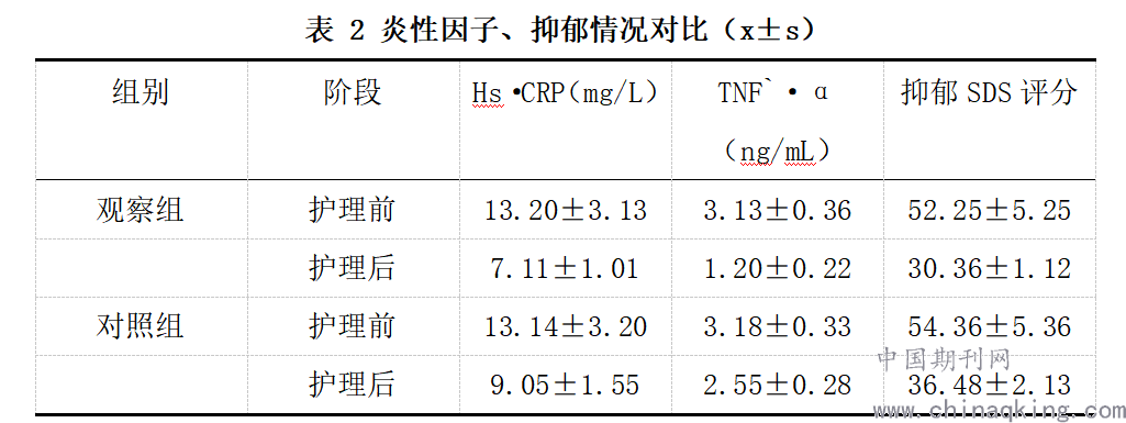 结合表2,对比炎性因子情况,治疗后,两组均出现下降情况,观察组下降较为明显,P<0.05。对比抑郁SDS评分,治疗后,两组均出现一定程度下降,观察组更加显著,P<0.05。
