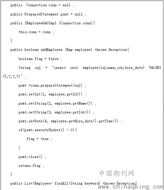 (4) DAO实现类。DAO实现类就是DAO接口的方法重写。DAO接口的抽象化有利于软件的松耦合,是将定义与具体代码剥离的一种常见方式。在DAO实现类函数中,将访问数据库的SQL语言操作封装起来,对外提供基于对象的形参或者返回值,实现从面相数据的编程到面相对象编程的升级,这种实现方式也是O/RMapping技术实现原型,有利于代码的复杂封装,简单接口。