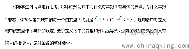 (设计意图:鉴于概括是思维的第一特征,在数学思维中发挥着十分重要的作用,因而概括能力是数学教学中需要重点培养的能力之一[3]。笔者通过引导学生对周期函数的概念进行归纳,不仅有助于学生对周期函数有更好的理解,而且可以培养学生的概括能力,提升数学能力。)