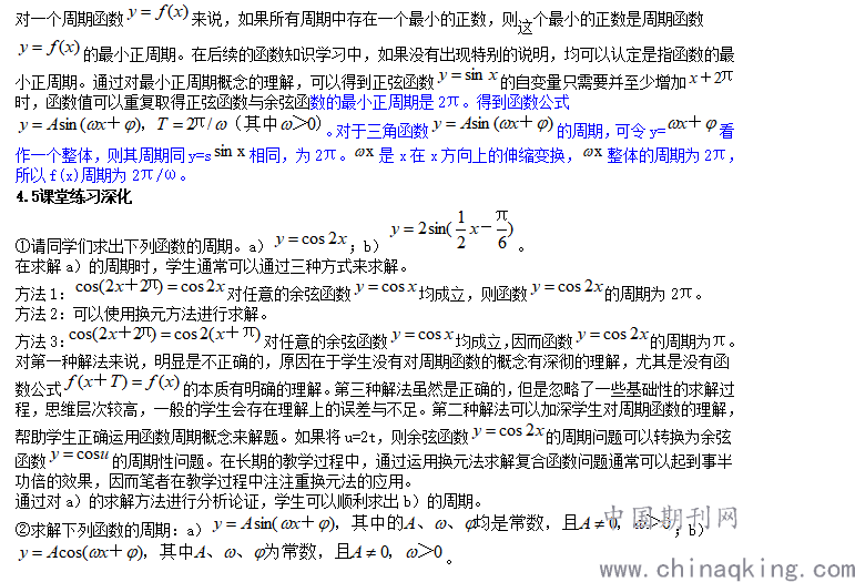 “三角函数的周期性”这一课的教学重点在于帮助学生更好的理解周期函数概念,并可以熟练应用周期函数的概念来求解三角函数的周期,属于重要的概念教学内容,因而在教学设计方面要打破以往的思想和模式。课堂小结重点突出数学教学的主体性、目标性、精炼性、引导性,逐步培养学生独立学习、自主探讨的学习能力。