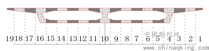 第三联桥面横向分为两幅,单幅箱梁宽16.5m,采用单箱双室断面,悬臂翼板宽2.5m,厚度16cm ~ 50cm;箱梁根部梁高3m(高跨比1/16),主跨跨中梁高1.3m(高跨比1/36.9),边跨端部梁高1.6m(高跨比1/18.8),箱梁底板轮廓线采用2次抛物线线形;箱梁根部腹板厚度65cm(端部边腹板厚度为70cm),中部腹板厚度45cm;箱梁底板厚度变化采用2次抛物线,由箱梁端部40cm渐变至跨中25cm。