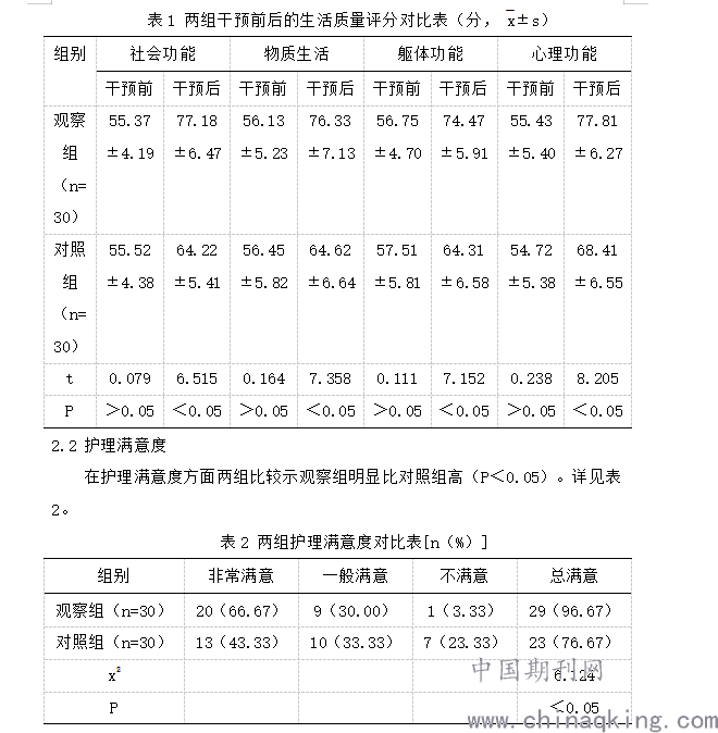 评价比较两组干预前后的生活质量评分及调查比较两组护理满意度。