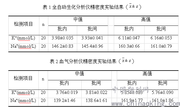 严格按照标准操作规程对血气分析仪和全自动生化分析仪进行保养和定标,室内质控品检测合格后再进行标本检测。批内精密度实验将两个浓度质控品一批内连续检测20次;批间精密度实验连续测定20天,每天做2个浓度水平。抗凝动脉血使用GEMpremier3500血气分析仪进行检测,需在15分钟内完成检测。检测完毕后,立即离心分离血浆,用日立7600-020seriez全自动生化分析仪检测电解质,需在40分钟内完成检测。