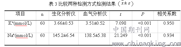 血气分析钾离子测定值为(3.51±0.52)mmol/L,生化分析钾离子测定值为(3.66±0.53)mmol/L,t检验统计学差异P<0.001,差异有明显统计学意义,两者之间的Pearson相关系数为0.950,呈强相关性。血气分析钠离子测定值为(138.5±5.38)mmol/L,生化分析钠离子测定值为(145.2±6.54)mmol/L,t检验统计学差异P<0.001,差异有明显统计学意义,两者之间的Pearson相关系数为0.934,呈强相关性。详见表3。