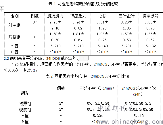 对两组患者临床各项症状进行比较,包括胸痛胸闷、神疲乏力、心悸、自汗盗汗、畏寒肢冷;对两组患者平均心率及2DCG中心率进行比较。