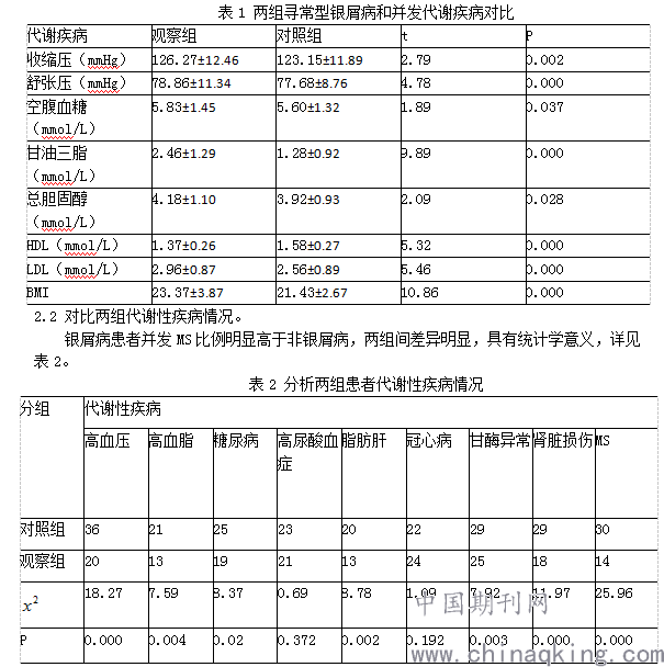 本次研究中发现银屑病患者的各项指标包括:三酰甘油、血糖、血压、总胆固醇、BMI、低密度脂蛋白均比对照组高,这说明银屑病患者存在各项代谢明显异常。有研究发现银屑病治疗好转的患者,其代谢指标也会有所好转,这也说明了银屑病和代谢综合症的相互关系。