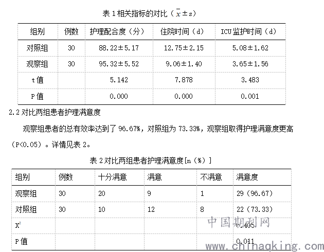 对相关指标进行统计,分别记录、住院时间、ICU监护时间,对护理配合度进行评价,调查患者的护理满意度。