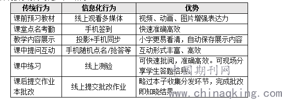 第一层次,对传统课堂教学行为进行替换升级,通过计算机辅助、移动互联网技术帮助学生和教师提高效率,获得更好的用户体验。这一层次的应用有以下特点:1、与传统教学场景保持一致,容易被广大教师理解和接受。2、通过软件预设功能操作,学习曲线平缓,上手快。3、使用即收获,效果立竿见影,心理上能激励使用者不断追求此类应用。大多数教师在这个层次的信息化应用都做得不错,有力服务了教学。第一层次信息化常见应用场景与传统教学行为对比如表1所示: