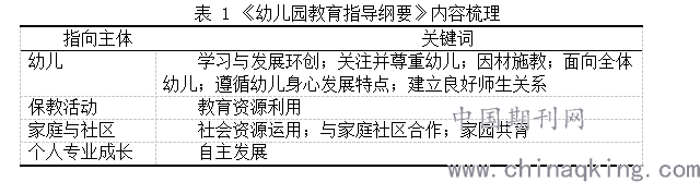 对《幼儿园教育指导纲要》中体现幼儿教师核心素养的关键词与指向主体进行梳理,如表1所示。[2]