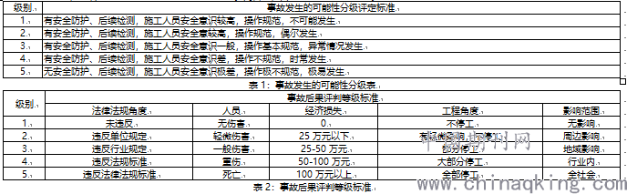 在水利工程施工过程中,想要有效控制与防范风险,应当建立一套通用的风险等级与评判机制,其中施工风险=事故发生的可能性X事故造成的后果,二者分别有不同分级,如下表所示。根据该公式,能够计算对应施工风险,并根据所得数值对风险进行评级,将风险分为以下几种:0-4:险;5-10:一般风险;11-15:中等风险;16-20:重大风险;21-25:巨大风险。针对不同等级的风险,应规划与之匹配的应急预案,并选择适宜的处理措施。