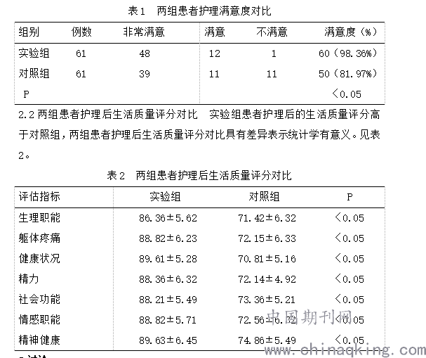 2.1两组患者护理满意度对比 实验组患者对护理的满意度高于对照组,两组患者护理满意度对比具有差异表示统计学有意义。见表1。