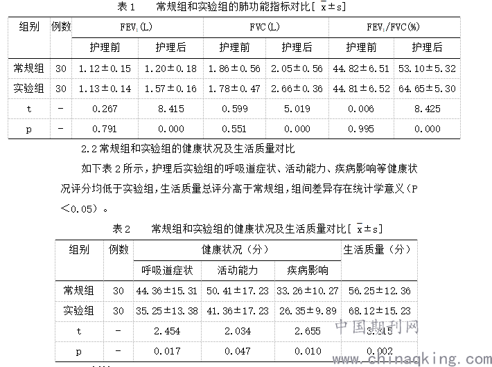 在本次研究中,给予老年慢性阻塞性肺疾病患者采取全科护理后的肺功能指标、健康状况及生活质量均具有明显的改善效果;该种护理方法的应用主要是借助科室内所有医护人员的力量,为患者在治疗过程中提供优质的护理服务,从组建全科护理队伍入手,为患者进行护理评估后根据实际情况给予肺康复训练、日常活动能力训练,充分改善其肺部相关指标的同时,提高临床病情状态和日常生活质量。