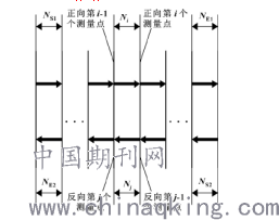 在进行测量的过程中,选取N个测量点,其中,→为正向间断运动,为反向间断运动。在对运动过程进行研究与分析中,NS1为开始越程量, NE1为结束越程量,NS2为反向开始越程量,NE2为反向结束越程量。此外,Ni-1、Ni、Ni+1属于正向间断运动量,Nj-1、Bj、Bj+1为反向间断运动量。具体的测量方法如下: