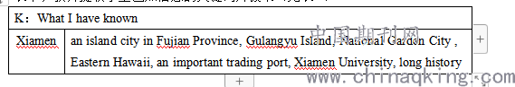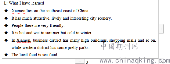 最后,教师播放厦门旅游宣传视频《看见厦门》,并设置情境:假如邀请你给厦门旅游宣传配上介绍文字,包括厦门的基本信息和特色内容,以此吸引游客前往厦门旅游。教师要求学生结合K表、W表和L表信息,课后完成介绍报告。