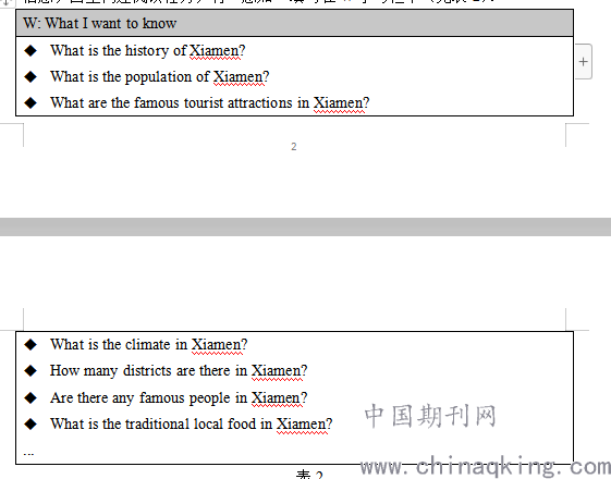 读前环节,教师引导学生关注文本标题“A Lively City”,并提问:What does this lively city refer to? 学生基于导入环节的提示信息,得出:This lively city refers to Xiamen. 接着,教师继续提问:What do you want to know about Xiamen before reading the text? 促使学生预测文本内容。学生根据预测及针对厦门想要了解的信息,自主构建阅读任务,将“想知”填写在W学习栏中(见表2)。