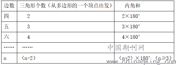 师:(归纳)很好,这节课我们通过对四边形、五边形、六边形内角和的探究学习,利用已学三角形内角和180°的知识,将多边形由一个顶点出发转化成若干个三角形得出多边形内角和公式(n-2)×180°