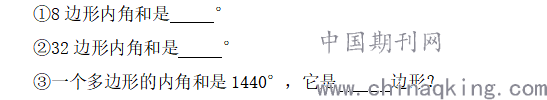师:同意这个答案吗?很好,来奖励一下(鼓掌)通过练习发现n取一个值时(n-2)×180°都有唯一确定的值,这是后面我们将要学习的函数知识 同一个知识点,可以由不同的题型展现,如练习③填空题变式为解答题 该如何做?