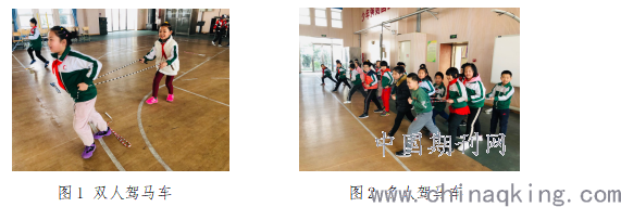 为了发展学生的奔跑能力,笔者设计了“小马车”游戏,根据参与人数的多少,可分为双人驾马车和多人驾马车,要求学生密切配合,体会利用短绳进行奔跑游戏,增加游戏的趣味性。而有关于跳跃能力方面的游戏,笔者根据学情设计了“流星锤”、“接地龙”、“图形跳”三个游戏。此外,利用短绳还可以发展学生的力量能力,如笔者按要求在进行“斗智拉绳”的过程中增加绳子牢固度,着重发展学生的上肢力量,若考虑到场地器材的安全性与便携性,也为了让学生体会并掌握肩上屈肘和转体挥臂以及原地抛投的投掷方法,笔者还设计了“轻物投掷”的游戏,让学生在头脑中初步形成投掷概念的基础上,强化以组为单位,将绳子绕成“球状”或折叠绕成“棒”形或“锤”形,以作为轻物投掷练习。
