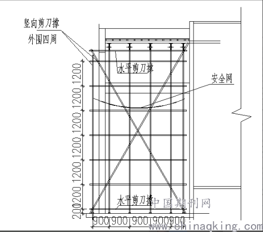 在支撑架外侧周圈设由下至上的竖向连续剪刀撑,在纵横向每6-10m设由下至上的竖向连续式剪刀撑,剪刀撑杆件的底端应与底板面顶紧,夹角宜为45°-60°,上部应与模板顶紧。剪刀撑用旋转扣件固定在与之相交的横向水平杆的伸出端或立杆上,旋转扣件中心线至主节点的距离不宜大于150mm,扣件设置三个。分别在架体扫地杆和最上一步横杆加设水平剪刀撑。
