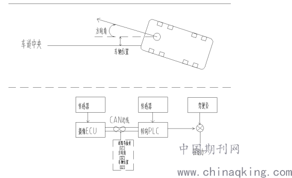 全地面起重机转向辅助控制系统,是由转向PLC和摄像ECU及各传感器组成;转向PLC和摄像ECU通过CAN总线进行信息交互。工作原理为摄像ECU将车道识别信息以及车道弯曲角度,发送至转向PLC,转向PLC采集车辆四周雷达探头及位置传感器信息,计算车辆处于当前路段位置,以及车辆前进线和当前路段中央线的夹角,通过以上信息计算后推荐通过此路段应选择的最优转向模式以及最优的实时转向角度,驾驶员根据系统提示,选择最优转向模式,实时调整方向盘最优转向角度,可提高全地面起重机狭小且弯曲车道通过率、节省大量的时间和人力;同时车辆在行驶转向时,雷达探头会采集车辆两侧盲区信息,对可能造成的碰撞提前预警,保障行驶中转向的安全性。原理及示意图如下所示: