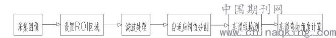 本车道识别算法是基于SCARF系统以及ALVINN系统的运用,主要为利用双目视觉原理,通过摄像头采集汽车前方视野,摄像ECU从采集到的图像中选取汽车左、右车道边界数据,通过对道路左右边界的数据进行处理,确定车辆所在区域车道边界线,同时计算车道弯曲角度,并将车道线及弯曲角度呈现在显示频上。具体流程如下所示: