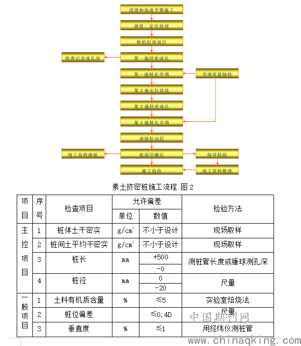 素土挤压桩施工技术是指通过挤压作用的方式提高桩间、桩周地基土的密实度,然后,在桩孔内填入粉土或者粘性土,再次进行分层夯实处理,提高地基土的隔水性,形成质量较高的土桩。以工业园厂房工程项目为例,桩基工程采用密DDC桩技术处理地基,共约5968个,采用正三角形挤密桩位布置,桩心距为0.9m,挤密孔直径为0.4m,采用素土回填,填料为一般粘性土、壤土或者Ip>4的粉土,填料中有机质含量≤5%。具体的施工步骤包括清基、平整场地,桩孔定位,桩机就位,成孔,孔内填料等(如图2),施工结束后,还需要根据挤密土桩工程质量检验标准(如表1)检查成桩的质量和复核地基承载量,确保地基整体质量。