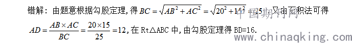 例7.已知在Rt△ABC中,两直角边的长为20和15,求BD的长.