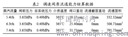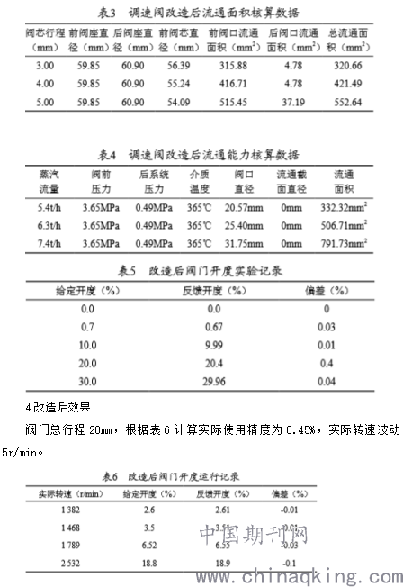 1)XQ310联合气阀通过改变阀芯与阀座的流通面积来增大阀门的行程,由原设计阀芯直径Φ69.85mm(前)和Φ70.9mm(后)减小为Φ59.85mm(前)和Φ60.9mm(后),在相同开度(10mm)下流通面积由2139.64mm2下降至1815.78mm2,流通面积减小15%。将原设计电液执行器改为气动薄膜执行机构,选择气动直行程调节阀,硬连接可以消除间隙问题。2)阀门正常开度下不平衡力为460N,选用的执行机构最大推力为8134N。3)阀门定位器精度高,稳定性、可靠性高,因现场存在振动,使用山武分体式定位。4)转速故障阀门可切至手动控制。5)现场配备断气保位阀和机械手轮。6)根据表3、表4调速阀流通面积和流通能力的数据进行核算,6.6t/h蒸汽流量(进气压力3.65MPa,排气压力0.49MPa下)对应流通面积为506.71mm2;以2020年当前二期引风机运行最大实际流量是6.6t/h,计算运行最大开度4.5mm,约22%。7)阀门总行程20mm,根据表5计算测试精度为0.4%,理论转速波动10r/min。