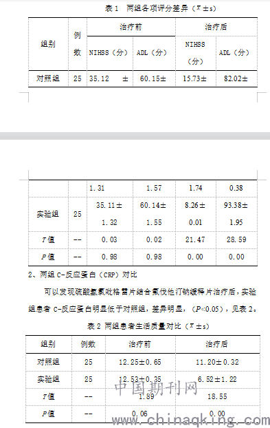 [摘要] 目的:探究氯吡格雷结合氟伐他汀治疗脑梗塞的临床疗效及对患者C-反应蛋白、TC水平影响。方法:研究时间段:2019年10月~2020年10月,选取50例本院接诊的脑梗塞患者,作为研究对象,随机抽取的方法,分为实验组25例,对照组25例,分别对两组患者实施硫酸氢氯吡格雷片结合氟伐他汀钠缓释片治疗以及常规药物治疗,分析两组患者在治疗前后的NIHSS评分、ADL评分、C-反应蛋白、TC水平。结果:在对实验组患者实施氯吡格雷结合氟伐他汀治疗后,实验组NIHSS评分(8.26±0.01)分,明显低于对照组(15.73±1.74)分,(P<0.05);实验组ADL评分(93.38±1.95)分,明显高于对照组(82.02±0.38)分,(P<0.05);C-反应蛋白(6.52±1.22)mg.L-1,明显低于对照组(11.20±0.32)mg.L-1,(P<0.05);TC水平(3.36±1.32)mmol/L,明显低于对照组(4.28±2.45)mmol/L,(P<0.05)。结论:对脑梗塞患者实施氯吡格雷结合氟伐他汀治疗后,能够有效的改善患者的NIHSS评分、ADL评分以及C-反应蛋白、TC水平,得到了较好的治疗效果。