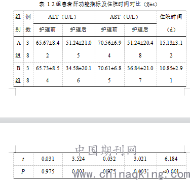 护理前,两组患者的ALT、AST水平对比无差异(P>0.05);护理后,B组患者的ALT、AST水平较A组有明显下降,且该组患者住院时间比较A组也有明显缩短(P<0.05)。见表1: