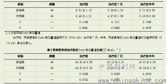 观察两组患者的Cobb角大小,术后,对患者实行X线检查,测量Cobb角大小。