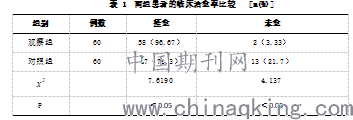 观察组的临床治愈率为96.67%(58/60),明显优于对照组的78.3%(47/60),统计学检验比较差异有统计学意义(P<0.05)。见表1。