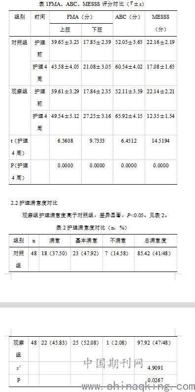 摘要:目的:分析脑梗塞患者接受早期康复护理模式干预的价值及对改善肢体功能、语言功能的影响?。方法:纳入本院脑梗塞急性期患者共96例为研究对象,于2018年7月~2020年10月期间开展对比性护理研究。将患者随机分组后,予以对照组(48)例常规护理,观察组(48例)早期康复护理。比较患者肢体功能、语言功能改善效果及护理影响差异。结果:护理前1日,患者肢体功能、语言功能、神经系统功能评分结果对比无统计学差异,P>0.05;护理4周时,观察组上肢FMA、下肢FMA及ABC失语评分较同期对照组提升明显,观察组MESSS评分较对照组下降,差异有统计学意义,P<0.05;观察组护理满意度高于对照组,差异显著,P<0.05。结论:早期康复护理模式干预实施,可有效辅助临床治疗改善脑梗塞患者肢体功能、语言功能,促进神经系统功能恢复,护理效果显著。