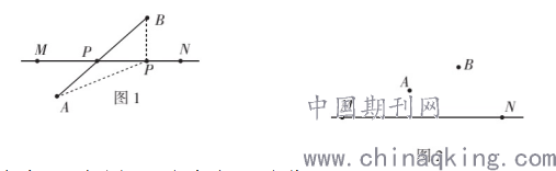 分析:如图1,直接连接A、B两点,根据两点之间线段最短或者三角形的两边之和大于第三边可知, 使得AP+BP取得最小值的点即为线段AB 与直线MN 的交点P′.这是一种图形变换,由原题的两点同侧改为两点异侧,较原题简单,可以在原题之前讲解,引导学生回忆两点之间线段最短或者三角形三边关系的知识.同时也可以总结出求线段和的最小值时应该确定初始点和终止点在直线异侧。