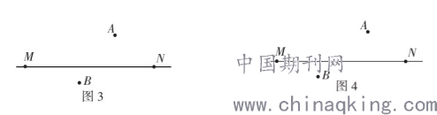 变式4:如图4,在直线MN上找一点P,使得|PA-PB|的值最小,求点P的位置。