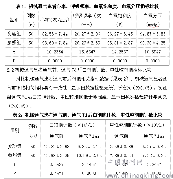 针对2019年8月至2020年8月本医院诊治的机械通气患者纳入实验资料,100例,分组法为随机数字表法,分别是实验组(n=50)与参照组(n=50)。实验组机械通气女男比是16比34。年龄上限90岁,年龄下限50岁,年龄均值是(72.56±8.34)岁。参照组机械通气女男比是16比34。年龄上限90岁,年龄下限50岁,年龄均值是(71.44±9.56)岁。对2组机械通气患者年龄、性别数据资料实行验证,P>0.05,具有可比性特征。
