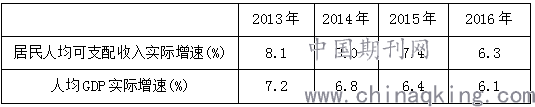 从本题的设问“从这些数据中可以看出”,该题属于“现象类”,也就是要分析图表中的两组数据“2013年--2016年居民人均支配收入增速、人均GDP实际增速”的纵向变化以及这两个实际增速的数据之间的横向对比。从图表的数据项目“居民人均支配收入增速(%)、人均GDP实际增速(%)”可以看出,本题要比较的是增长率的变化情况,而不是两项收入的数值。解决经济数据图表题解题要遵循“三看”的思路与过程:一看标题,确定图表的主题是什么;二看图表,对图表数据进行观察与分析,作纵向与横向对比;三看备注,备注是对图表的补充说明。然后结合常规的题型进入解题环节。