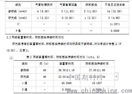 对比两组的并发症情况,包括气管粘膜损伤、气管套管阻塞、肺部感染;对比两组的的留置管时间、肺部感染持续时间。