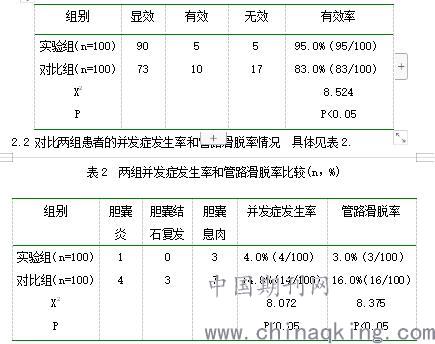 本次研究结果显示,接受引流管管道护理的实验组患者的治疗有效率为95.0%,接受常规护理的对比组患者的治疗有效率为83.0%,实验组显著高于对照组,组间差异显著(P<0.05)。实验组并发症发生率为4.0%,管路滑脱率为3.0%,对比组并发症发生率为14.0%,管路滑脱率为16.0%,实验组显著低于对照组,组间差异显著(P<0.05)。证实了对复杂性肝内胆结石患者术后的患者实施引流管管道护理可以取得预期的综合效果。